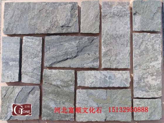 Forest green natural face castle stone. 1. Color: gray, grass green. 2. Material: natural quartzite. 3. Processing method: natural cleaving and cutting. 4. Specifications: small combination. 100*100*15-25, 100*200*15-25, 100*300*15-25. 200*200*15-25. Unit mm or customized according to customer requirements. 5. Conventional thickness weight parameter: about 20 m2 / ton. 6. Packing: 1) ordinary wooden cases (domestic and export are used. Strong and strong for long distance transportation, if the export needs fumigation. 2) avoid fumigation plywood (special for export, fumigation, slightly inferior to ordinary wooden cases). 6. Application scope: high-end residential areas, villas, clubs, hot spring hotels, resorts, beautiful countryside construction, etc. 7. Sales line: mobile phone WeChat and the same number +8615132950888. (if you need more clear pictures, please call or WeChat), we will serve you sincerely.